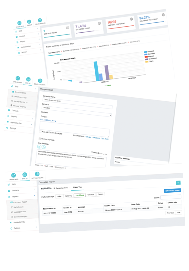 Informasi biaya per SMS masing-masing operator lengkap dengan histori transaksi pengisian saldo SMS. Berbagai notifikasi email otomatis terkait saldo SMS, harga SMS, approval sender, dll.