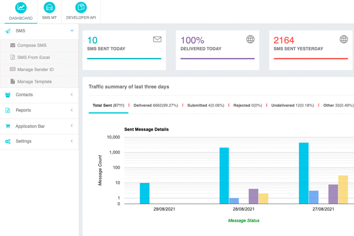 Halaman dashboard menyajikan informasi ringkasan jumlah pengiriman SMS hari ini dan kemarin lengkap dengan persentase, grafik jumlah dan status, statisrik sukses.