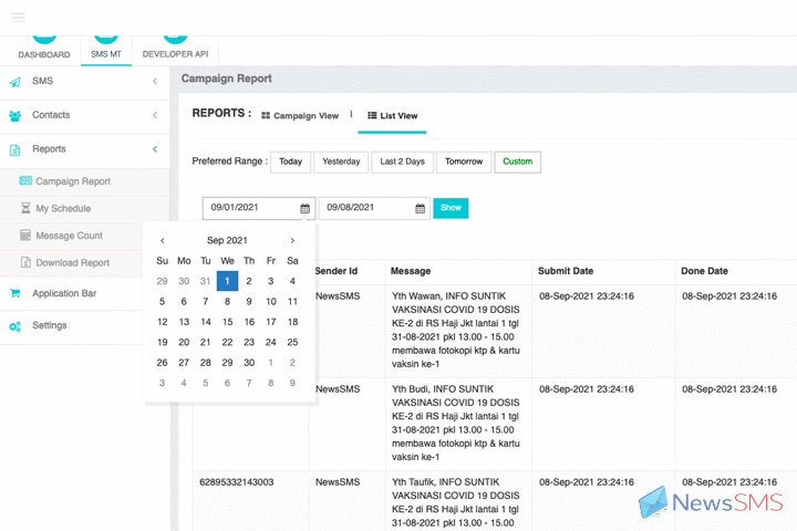 Laporan pengiriman SMS disajikan dengan sangat detail tentang nomor hp, sender id, pesan, waktu tersubmit, waktu terkirim, status dan kode error. Laporan dapat di download dalam bentuk .csv